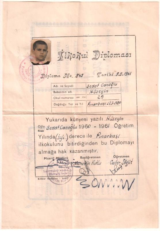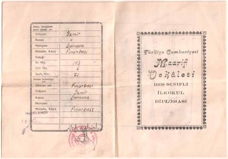 Türkiye Cumhuriyeti Maarif Vekaleti İzmir Pınarbaşı İlkokul Diploması / 1960 - 1961 ders yılı...
