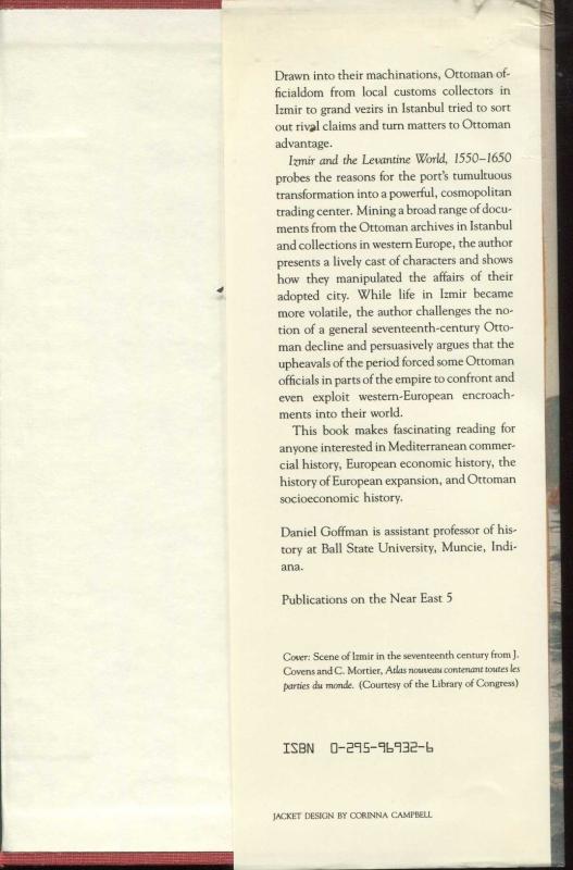 Tam Adı: Izmir and the Levantine World, 1550–1650 Yazar: Daniel Goffman (Ball State Üniversitesi'nde Tarih Profesörü) Yayınevi Serisi: Publications on the Near East 5 ISBN: 0-295-96932-6 Kapak Tasarımı: Corinna Campbell Kapak Görseli: J. Covens ve C. Mortier'in "Atlas nouveau" eserinden 17. yüzyıl İzmir sahnesi (Library of Congress izniyle)