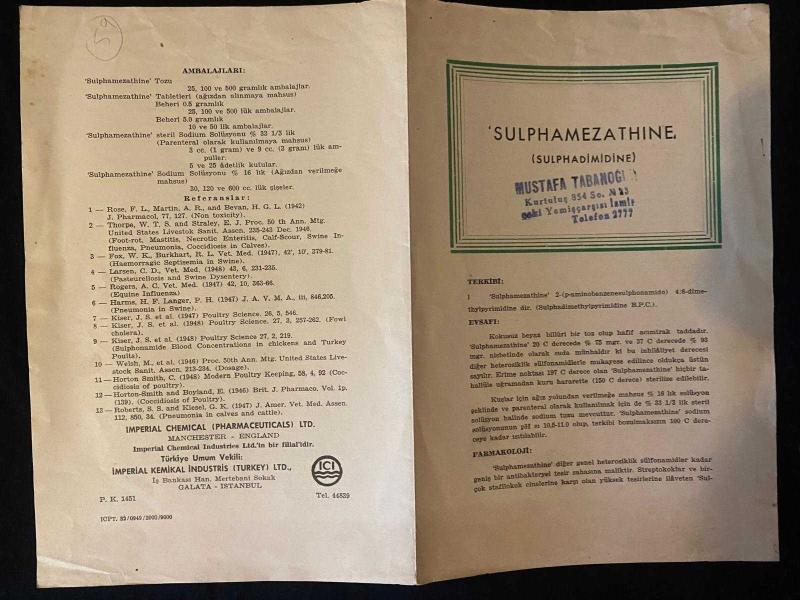 İzmir eczacılık / veterinerlik tarihi: Sulphamezathine adlı ilacın tanıtım broşürü (prospektüs) Mustafa Tabanoğlu kaşeli., en son 6 ay önce güncellenmiştir.