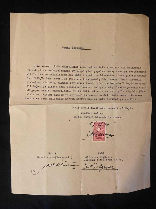 İzmir tütün tarihi: 1945 senesinde Dimitri Amira ile Emin Dramalı arasında imzalanan tütün mahsulü alacak verecek ibranamesi, damga pullu.