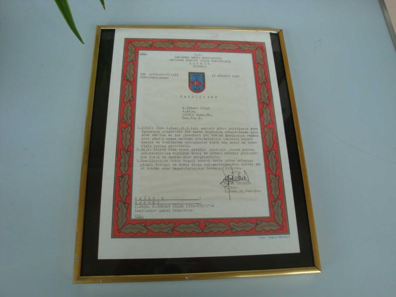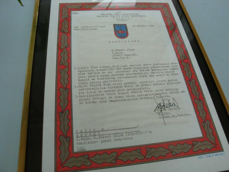 J. Asteğmen M. BÜLENT DİLEK 'e Jandarma Genel Komutanlığı Tarafından Verilen TAKDİRNAME BELGESİ ( 1997 YILI / TERÖRLE MÜCADELE İÇİN VERİLEN TAKDİR BELGESİ ) ÇERÇEVELİ " Ürün HASARSIZ / HATASIZ durumdadır , belirtilen ölçüler " ÇERÇEVELİ " olarak ölçülmüştür "