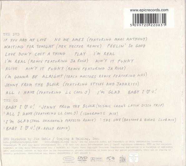 The CD CD-1 Baby I Love U! 4:29 CD-2 Jenny From The Block (Seismic Crew's Latin Disco Trip) 6:42 CD-3 All I Have (Ignorants Mix) 4:04 CD-4 I'm Glad (Paul Oakenfold Perfecto Remix) 5:48 CD-5 The One (Bastone 2 Burnz Club Mix) 7:41 CD-6 Baby I Love U! (R. Kelly Remix) 4:12 The DVD DVD-1 If You Had My Love (Video) DVD-2 No Me Ames (Video) DVD-3 Waiting For Tonight (Hex Hector Remix) (Video) DVD-4 Feelin' So Good (Video) DVD-5 Love Don't Cost A Thing (Video) DVD-6 Play (Video) DVD-7 I'm Real (Video) DVD-8 I'm Real (Remix) (Video) DVD-9 Ain't It Funny (Video) DVD-10 Alive (Video) DVD-11 Ain't It Funny (Remix) (Video) DVD-12 I'm Gonna Be Alright (Track Masters Remix) (Video) DVD-13 Jenny From The Block (Video) DVD-14 All I Have (Video) DVD-15 I'm Glad (Video) DVD-16 Baby I Love U! (Video) 2003 VIDEO CLIP DVD + CD DIGIPACK CD