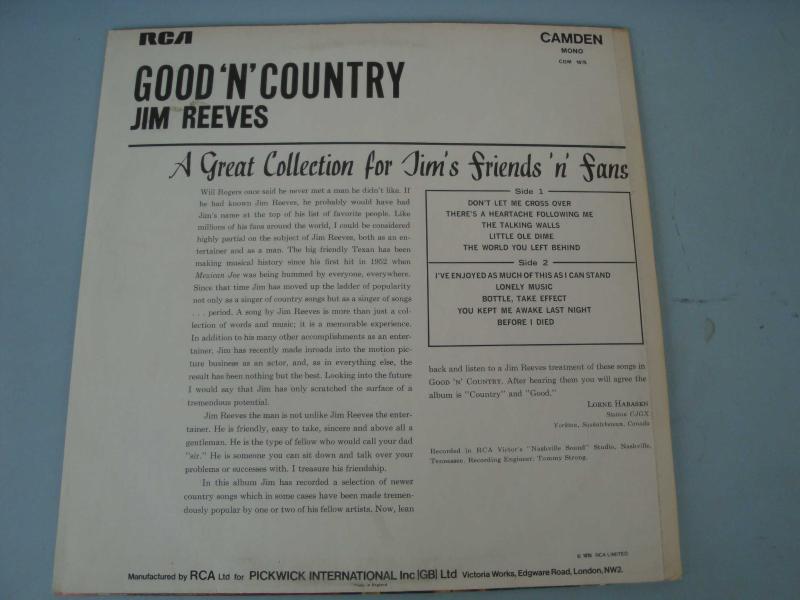 JIM REEVES " Good 'N' Country " LP RCA RECORDS Kap : 9,5 - Plak : 9,5 Kapak , Plak MÜKEMMEL durumda ..