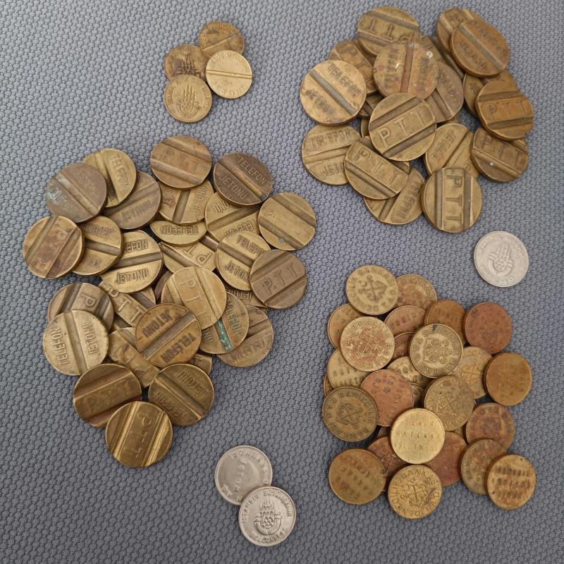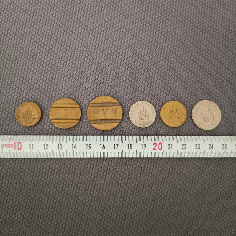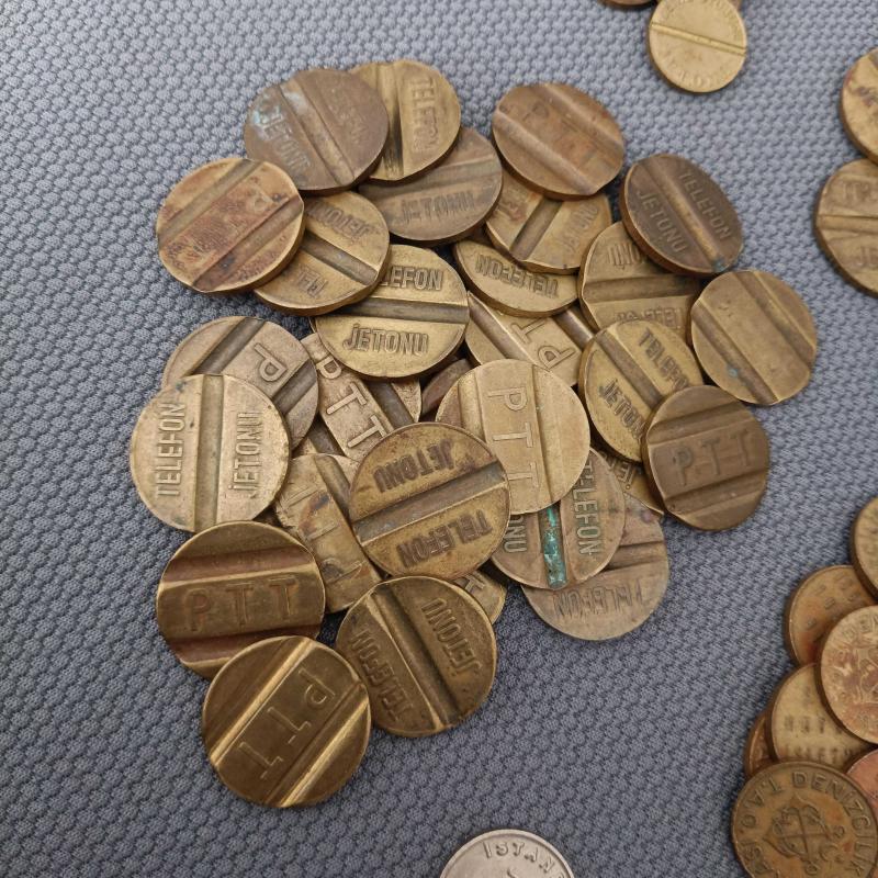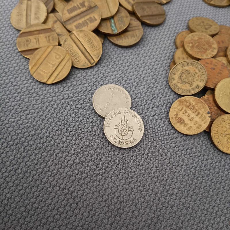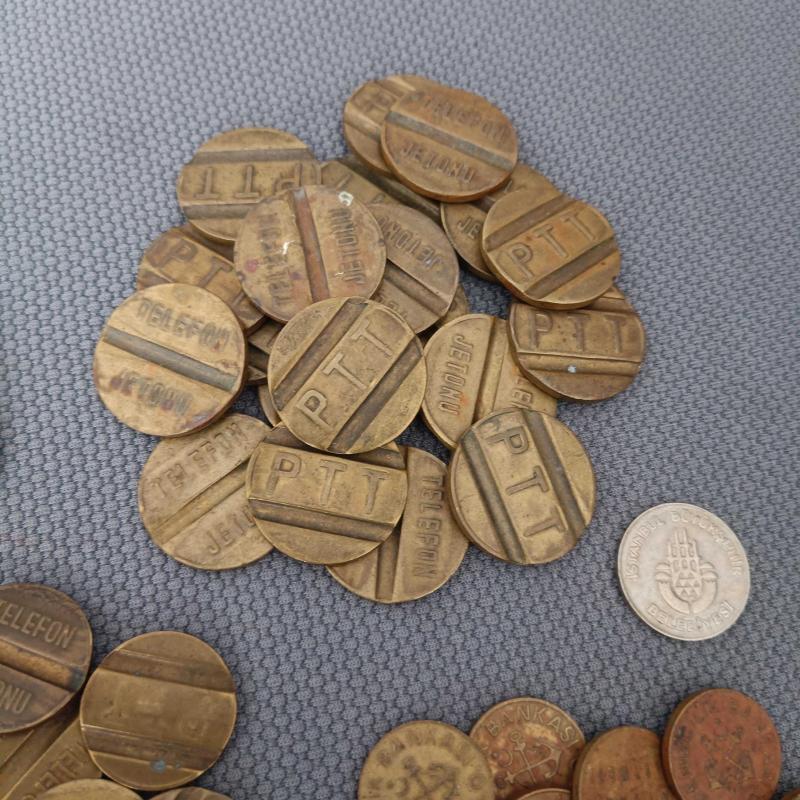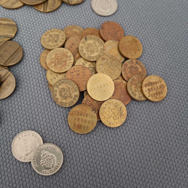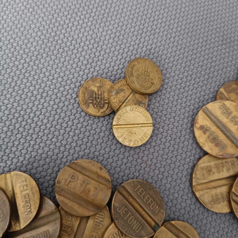 Toplam 86 Adet / 6 Çeşit Eski Jetonlar Ptt Büyük Jeton 20 adet Ptt Küçük jeton 31 adet İstanbul Ulaşım 1 adet İstanbul Ulaşım 2 adet Deniz Otobüsü 4 adet Denizcilik Bankası Şehir Hatları 28 adet
