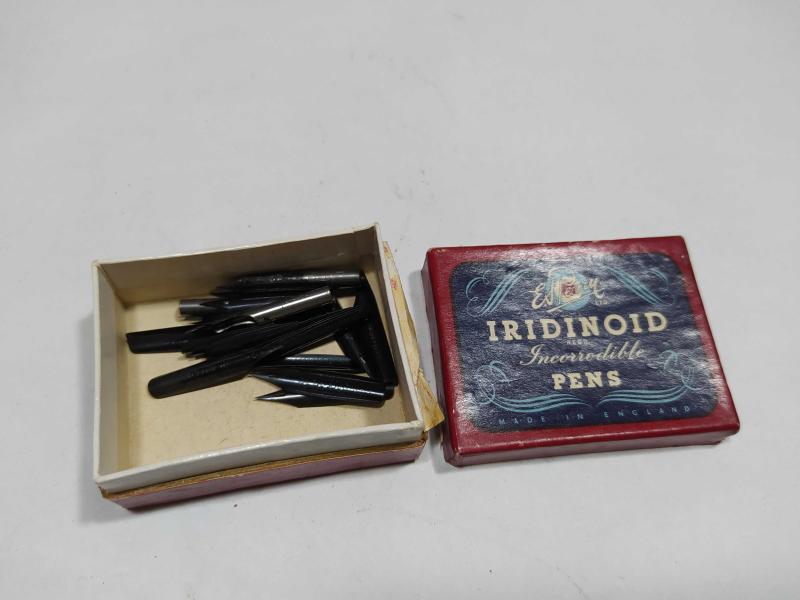 K112-----IRIDINOID PENS KUTU DOLUSU ANTİKA İNGİLİZ KALEM UCU başlıklı antika/koleksiyon objesi Avrupa menşe’lidir. 1940 sonrası dönemine aittir.