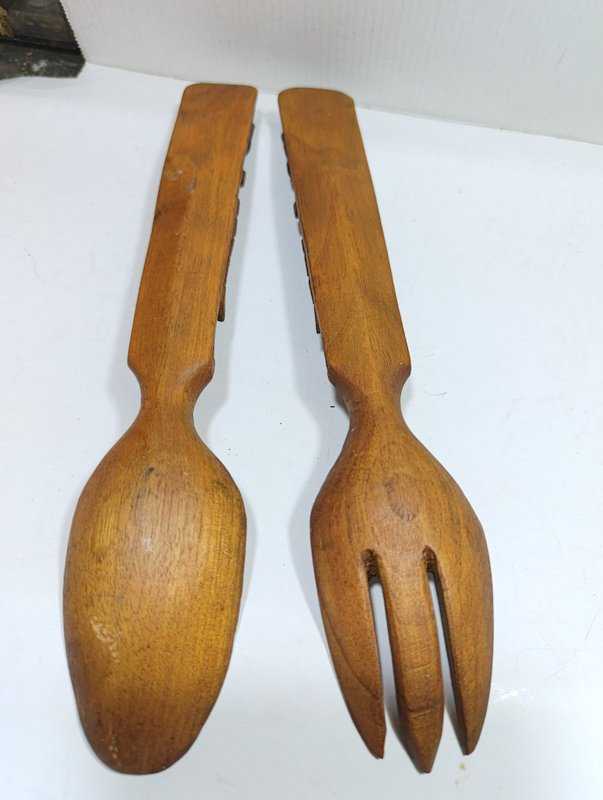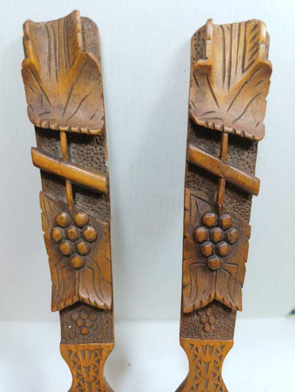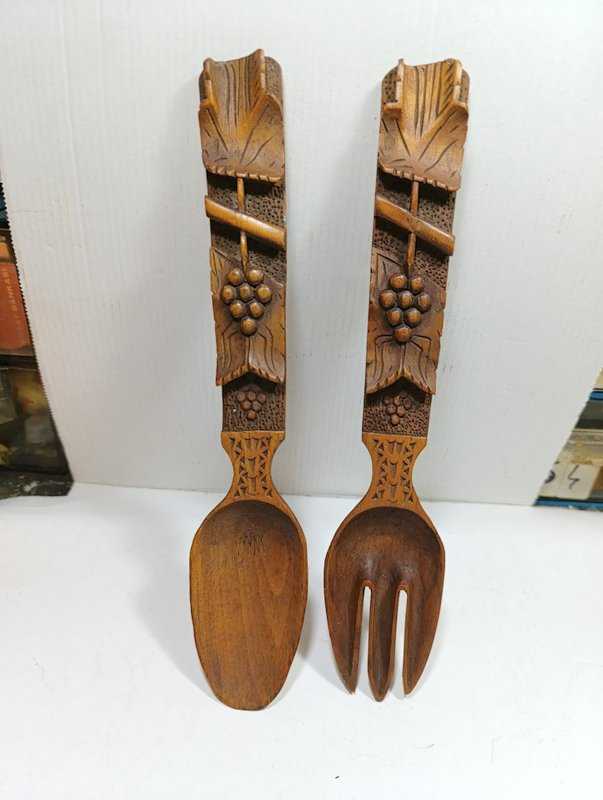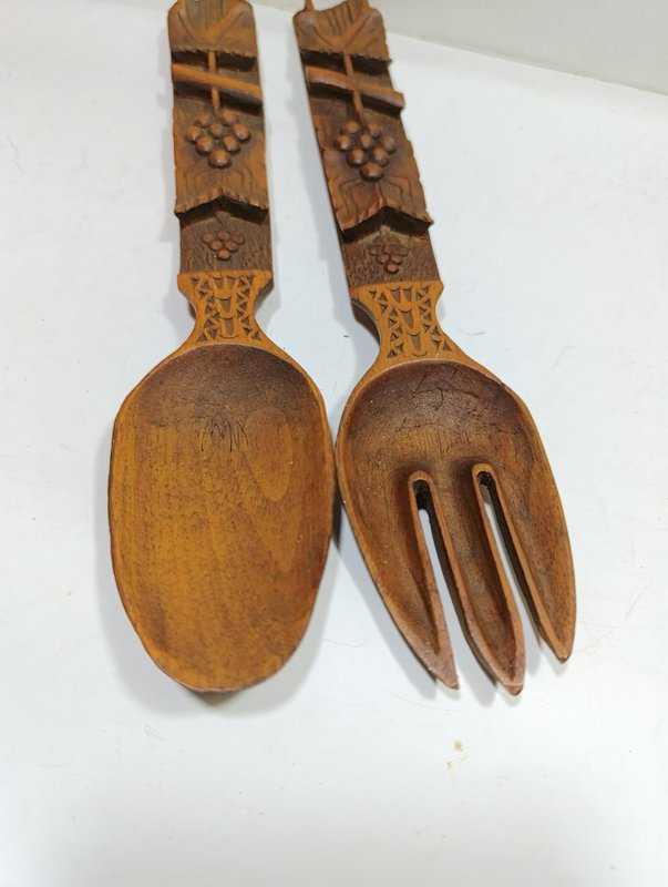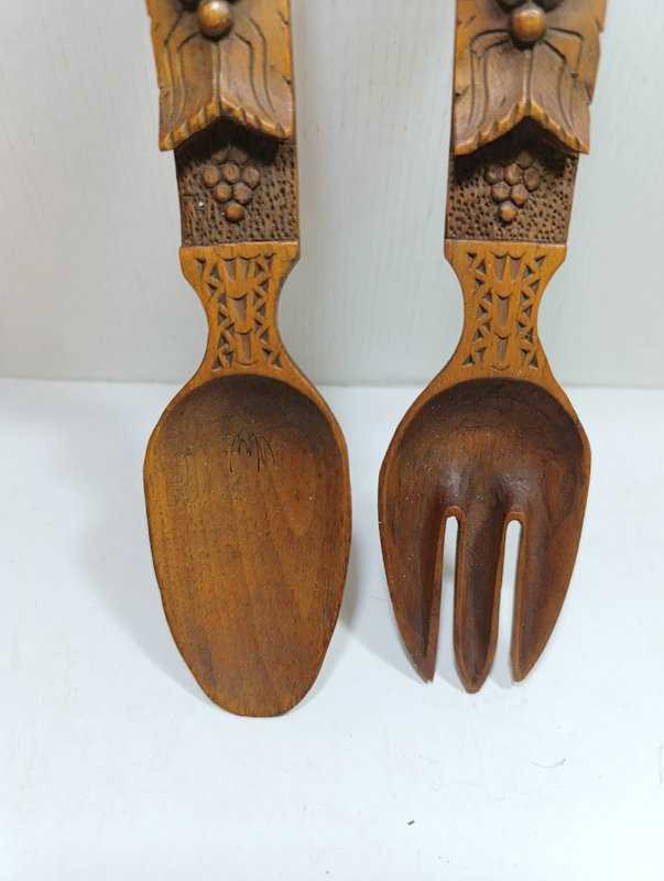 K133----1940-1950'LERDEN TEK PARÇA AHŞAPTAN, ÜSTÜ KABARTMA İŞÇİLİKLİ ÜÇ BOYUTLU DESENLERLE SÜSLÜ BİR ÇİFT ÇATAL KAŞIK başlıklı ürün, Antika-Koleksiyon, Hobi-Sanat > Antika > Antika Ahşap objeler > Ahşap Mutfak Objeleri kategorisinde İkinci El olarak satışa sunulmuştur.