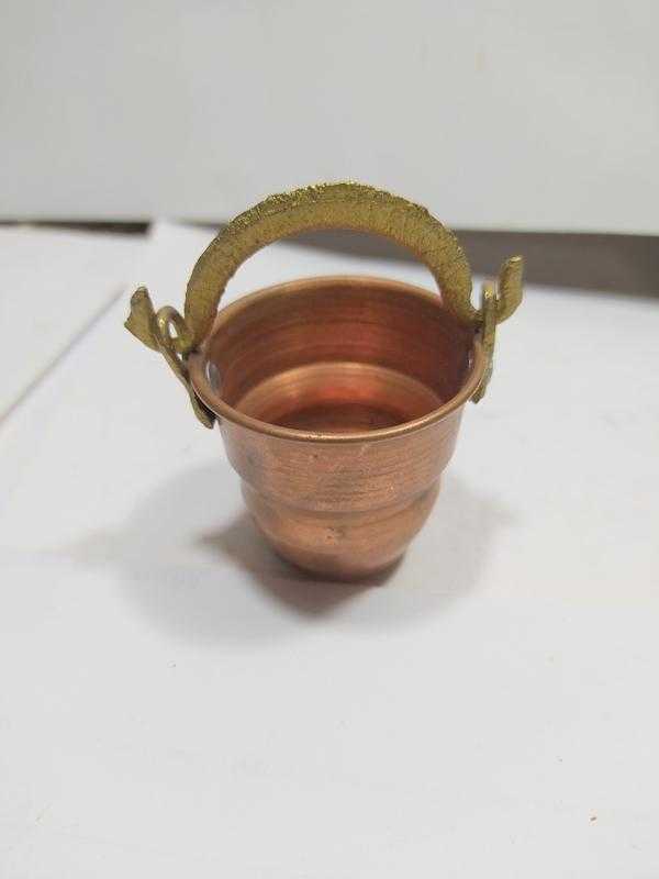 K199---DEKORLUK MİNİ BOY BAKIR KOVA başlıklı antika/koleksiyon objesinin menşei belirtilmemiştir. Objenin ait olduğu dönem bilinmeketedir.