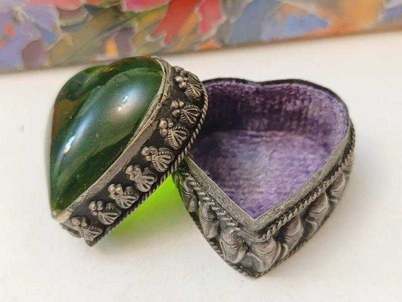 K204------KALP ŞEKLİNDE YEŞİL DOĞAL TAŞ KAPAKLI TÜRKMEN İŞİ KUTU başlıklı antika/koleksiyon objesi Avrupa menşe’lidir. 1950-1999 arası dönemine aittir.