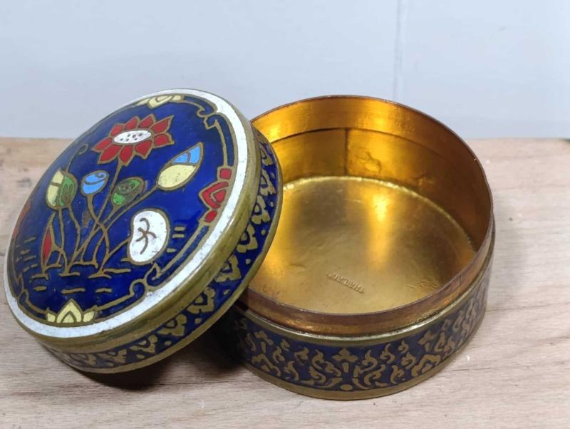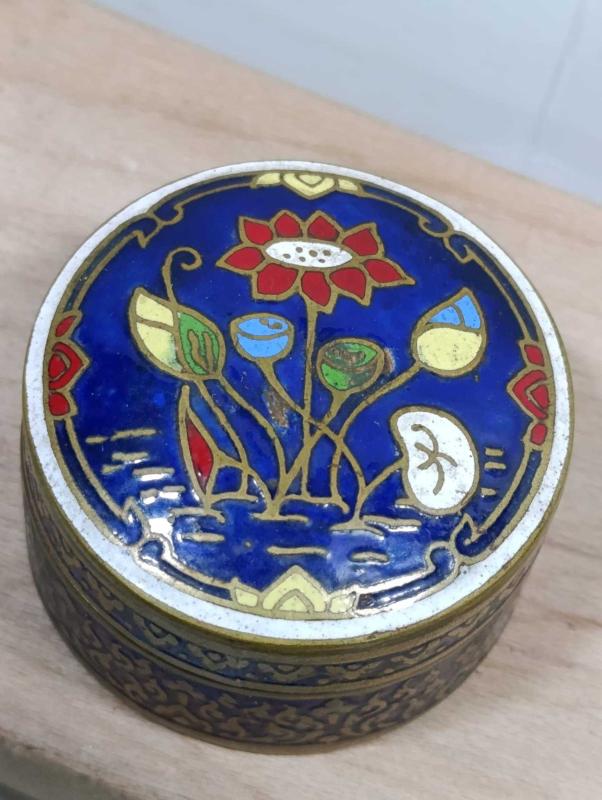 K232----ÇİÇEK DESENLİ KAPAK MİNELİ ESKİ PİRİNÇ KUTU başlıklı antika/koleksiyon objesinin menşei belirtilmemiştir. Objenin ait olduğu dönem bilinmeketedir.