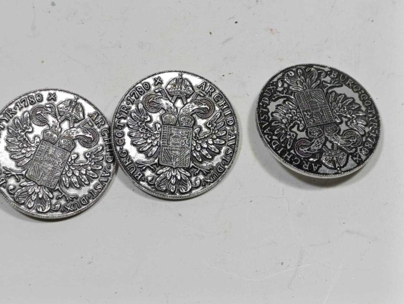K53---ÇİFT BAŞLI KARTAL 1870 TARİHLİ PARA REPLİKASI ALÜMİYUM ÜÇ ADET DÜĞME başlıklı antika/koleksiyon objesinin menşei belirtilmemiştir. 1920-1940 arası dönemine aittir.