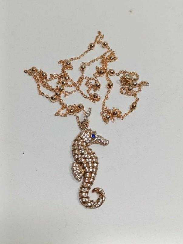 K78----------- TAŞLI ALTIN RENGİ KAPLAMA DENİZ ATI KOLYE başlıklı antika/koleksiyon objesinin menşei belirtilmemiştir. Objenin ait olduğu dönem bilinmeketedir.