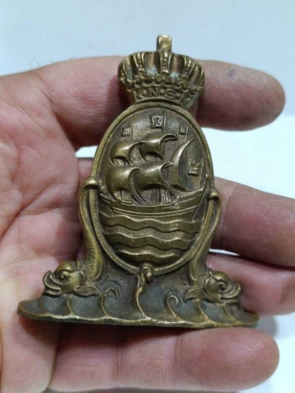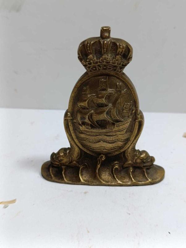 K93---YELKENLİ GEMİ VE KRAL TACI DEKORLU PİRİNÇ OBJE başlıklı antika/koleksiyon objesinin menşei belirtilmemiştir. Objenin ait olduğu dönem bilinmeketedir.