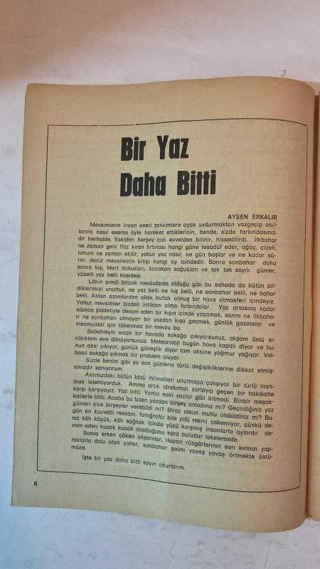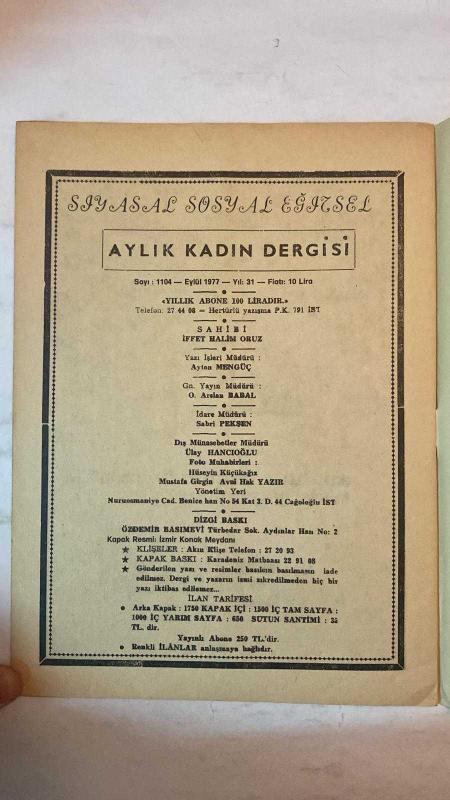 KADIN DERGİSİ, SİYASAL, SOSYAL, EĞİTSEL - TARİH: EYLÜL 1977 - SAYI: 1104 ULUSLARARASI İZMİR FUARI YAŞANTISINI CANLANDIRDI, YAZAR: SABRİ PEKSEN - SAFRANBOLU'DA BİLGİN HALKA YAYILMASI SEMİNERİ, YAZAR: HASENE ILGAZ - BİR YAZ DAHA BİTTİ, YAZAR: AYŞEN ERKALIR - 10. DONANMA KUPASI DENİZ YARIŞMASI, YAZAR: BELİRTİLMEMİŞ - ÇARE BULMAZSIN NEDEN?, YAZAR: ADİL ÜLKÜ - SABAH OLACAK..., YAZAR: SEVİLAY FIDANOĞLU - YAZIK OLDU SANA GÜZELİM VESSELAM, YAZAR: KENAN TAYMAZ - AHMET HİKMET - FERİT RAGIB TUNCAN - GÖZLEİRME BAK, SEVLAY FİDANOĞLU - YAĞMUR GÖZLÜM'E, MÜNEVVER SARIOĞLU - YALANCI YARINLAR, YAZAR : ADİL ÜLKÜ - KENAN AKANSU - TAM TAKIM EKSİKSİZ 36 SAYFA, İFFET HALİM ORUZ tarafından kaleme alınmıştır. Eser AYTEN MENGÜÇ editörlüğünde hazırlanmıştır. KADIN DERGİSİ, SİYASAL, SOSYAL, EĞİTSEL - TARİH: EYLÜL 1977 - SAYI: 1104 ULUSLARARASI İZMİR FUARI YAŞANTISINI CANLANDIRDI, YAZAR: SABRİ PEKSEN - SAFRANBOLU'DA BİLGİN HALKA YAYILMASI SEMİNERİ, YAZAR: HASENE ILGAZ - BİR YAZ DAHA BİTTİ, YAZAR: AYŞEN ERKALIR - 10. DONANMA KUPASI DENİZ YARIŞMASI, YAZAR: BELİRTİLMEMİŞ - ÇARE BULMAZSIN NEDEN?, YAZAR: ADİL ÜLKÜ - SABAH OLACAK..., YAZAR: SEVİLAY FIDANOĞLU - YAZIK OLDU SANA GÜZELİM VESSELAM, YAZAR: KENAN TAYMAZ - AHMET HİKMET - FERİT RAGIB TUNCAN - GÖZLEİRME BAK, SEVLAY FİDANOĞLU - YAĞMUR GÖZLÜM'E, MÜNEVVER SARIOĞLU - YALANCI YARINLAR, YAZAR : ADİL ÜLKÜ - KENAN AKANSU - TAM TAKIM EKSİKSİZ 36 SAYFA adlı eser Türkçe dilindedir.