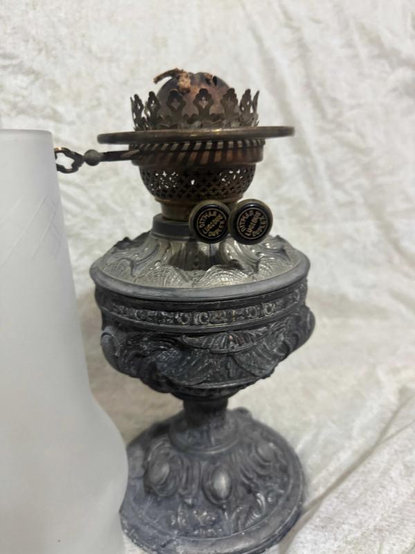 KALAY TABANLI ANTİKA VİKTORYA DÖNEMİ GAZ LAMBASI Camsız Yükseklik : 30 Camlı yükseklik 54 cm Genişlik: 18 cm Derinlik: 18 cm Rokoko tarzında dekore edilmiş kalay tabanlı Viktorya dönemi bir gaz lambası. Cam baca ve yuvarlak oyma cam gölgelikle kaplı çift brülöre sahiptir. Kosovadan satın aldım.