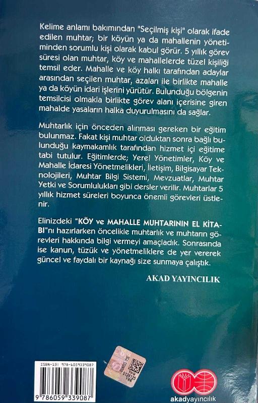 KANUN,TÜZÜK ve YÖNETMELİKLERLE KÖY ve MAHALLE MUHTARI'NIN EL KİTABI, AKAD YAYINCILIK tarafından kaleme alınmıştır. Eser ALİ İMREN editörlüğünde hazırlanmıştır. Kitap 2025 yılında AKAD BASIN YAYIN tarafından [ANKARA] yayınlanmıştır. 399 sayfadır. Sayfa bilgisi YENİ olarak belirtilmiştir. KANUN,TÜZÜK ve YÖNETMELİKLERLE KÖY ve MAHALLE MUHTARI'NIN EL KİTABI adlı eser Türkçe dilindedir. Eserin içeriğinde Türkçe dilinde bölümlere de yer verilmektedir.