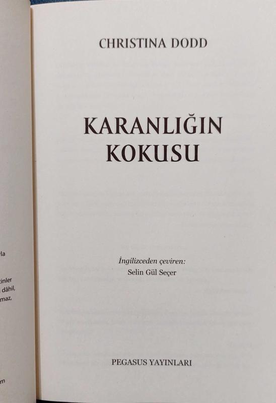 KARANLIĞIN KOKUSU, CHRISTINA DODD tarafından kaleme alınmıştır. Kitap 2017 yılında PEGASUS YAYINLARI tarafından [İSTANBUL] yayınlanmıştır. Satışta olan kitap, yayınevinin 1. baskısıdır. Bu baskının çevirisi SELİN GÜL SEÇER tarafından yapılmıştır. 334 sayfadır. KARANLIĞIN KOKUSU adlı eser Türkçe dilindedir.