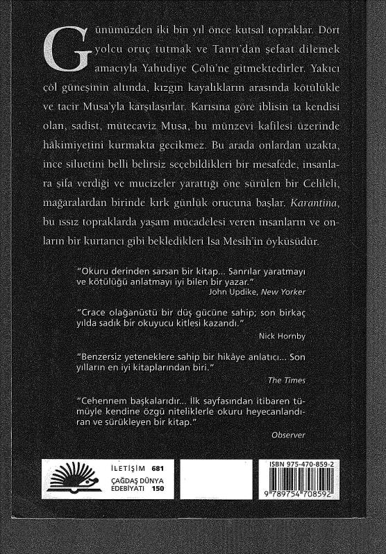 KARANTİNA, JIM CRACE tarafından kaleme alınmıştır. Kitap 2001 yılında İLETİŞİM YAYINLARI tarafından [İSTANBUL] yayınlanmıştır. Bu baskının çevirisi ELİF URAS AKHAN tarafından yapılmıştır. 264 sayfadır. KARANTİNA adlı eser Türkçe dilindedir.
