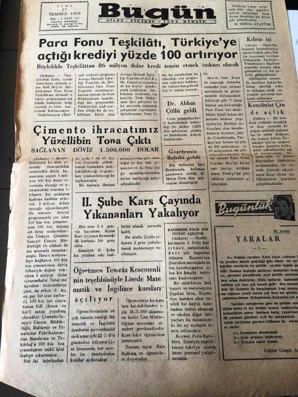 KARS BUGÜN GAZETESİ DİLDE FİKİRDE İŞDE BİRLİK YEREL TAŞRA BASINI --17 Temmuz 1959 Yıl :2 Sayı :401- Para Fonu Teşkilatı ,Türkiye 'ye Açtığı Krediyi Yüzde 100 Artırıyor --Çimento ihracatımız yüz eli bin tona çıktı - II.Şube Kars Çayında Yıkananları Yakalıyor - Dr. Abbas Çöllü Geldi -Komünist Çin de Açlık- Yaralar :Doktor :Cengiz Askeran -Türkistan Katliamı Yıpranma, sararmalar, kupon kesiği ve yırtılmalar zamana bağlı olarak görülebilir.