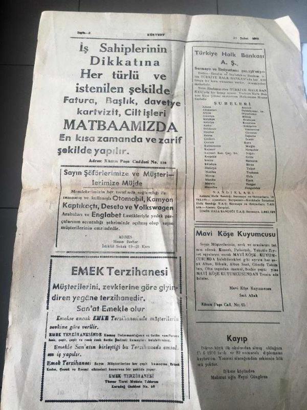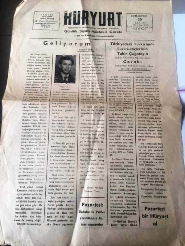 KARS HÜRYURT GAZETESİ YEREL TAŞRA BASINI - 20 ŞUBAT 1960 YIL :5 SAYI :1335- Geliyorum Osman Tunç - Türkiye de ki Türkistanlı Türk Gençlerinin Tahir Çağatay 'a Cevabı - Yıpranma, sararmalar, kupon kesiği ve yırtılmalar zamana bağlı olarak görülebilir.