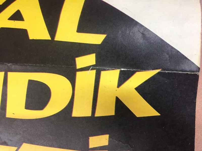 Sattığımız afiş / posterler dönemine ait orijinal ürünlerdir. Fotoğraflarda kondisyonları görebilirsiniz., Kondisyonlar temiz durumdadır. Aksi bir durum olduğunda ilave fotoğraf ve bilgi yer alacaktır. Kondisyon: Temiz, Sağ alt köşeden 6,7 cm'lik bir yırtılma arkadan şeffaf bant ile onarılmıştır, fotoğraflarda görülebilir.