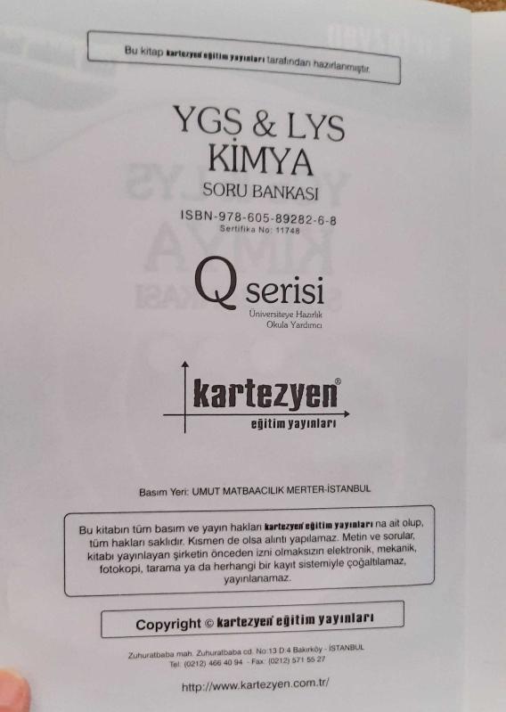 LÜTFEN AÇIKLAMAYI OKUYUN... KARTEZYEN YAYINLARI YGS-LYS KİMYA SORU BANKASI Q serisi 423 SAYFA 2007 BASKI SIFIR KİTAP