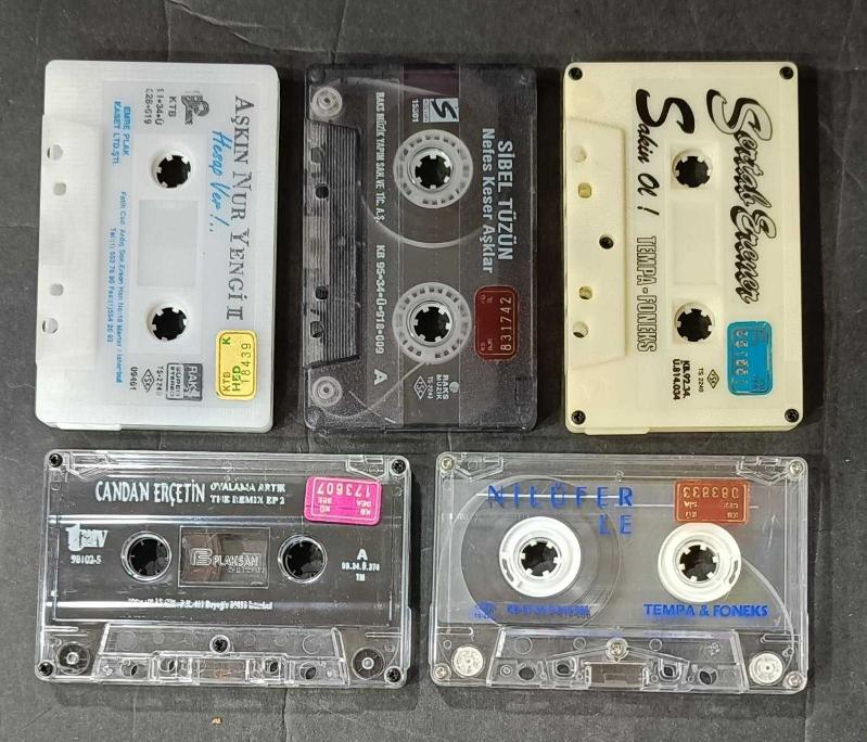 KAPAKSIZ KASET LOTU KUTU VE KARTONETLERİ YOKTUR, SADECE KASETLER GÖNDERİLECEKTİR. 2.EL, TEMİZ DURUMDA ALBÜMLER: 1 - NİLÜFER - NİLÜFER'LE 2 - SERTAB ERENER - SAKİN OL 3 - CANDAN ERÇETİN - OYALAMA ARTIK - THE REMIX EP 2 4 - SİBEL TÜZÜN - NEFES KESER AŞKLAR 5 - AŞKIN NUR YENGİ II - HESAP VER