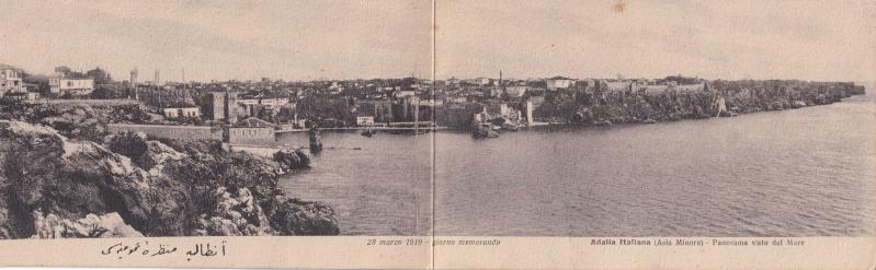 Antalya Panaroma Kart Antalya Manzara-i Umumisi = Adalia Italiana (Asia Minore) - Panorama visto del Mare, 28 Marzo 1919. Giorno Memorando. Osmanlıca İtalyanca açıklamalı. Editör: Fototipia Alterocca, Terni (Italia). Açılır hali, 28x9 cm.