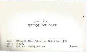 KARTVİZİT - AVUKAT ŞENOL YILMAZ - BÜRO : DENİZCİLER CAD. YÜKSEL HAN KAT :3 NO : 18/35 - TEL : 11 89 02 - ANKARA, 6 yıl önce satışa sunulmuştur.