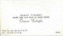 KARTVİZİT - SABAH TİCARET - EMLAK,ARSA ALIM SATIM VE TEKSİR BÜROSU - OSMAN KOLOĞLU - POSTA CAD.EGE HAN KAT 3 NO.61 - TEL : 10 73 86 - 11 15 92 -ANKARA, en son 2 ay önce güncellenmiştir.