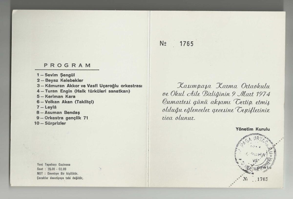 KASIMPAŞA KARMA ORTAOKULU 9 MART 1974 GÜNÜ EĞLENCELER GECESİ DAVETİYESİ..., en son bir saat önce güncellenmiştir.