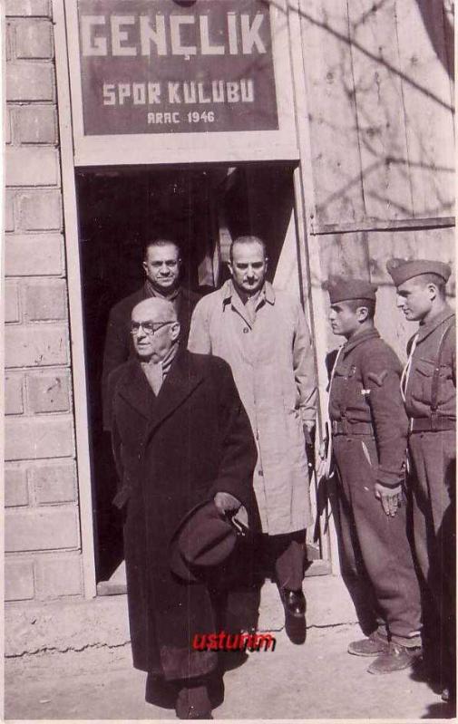 ** CELAL BAYAR VE ETHEM MENDERES FOTOĞRAFI ** Kastamonu'dan Zonguldak'a gitmekte olan Reisicumhurumuz Araç kasabasına da uğramış ve tetkiklerde bulunmuşlardır... Resim,Reisicumhurumuzu Araç Spor Kulübü'nün önünde göstermektedir... 17.5 x 11 cm.ebadında,çok temiz durumda orijinal fotoğraftır...