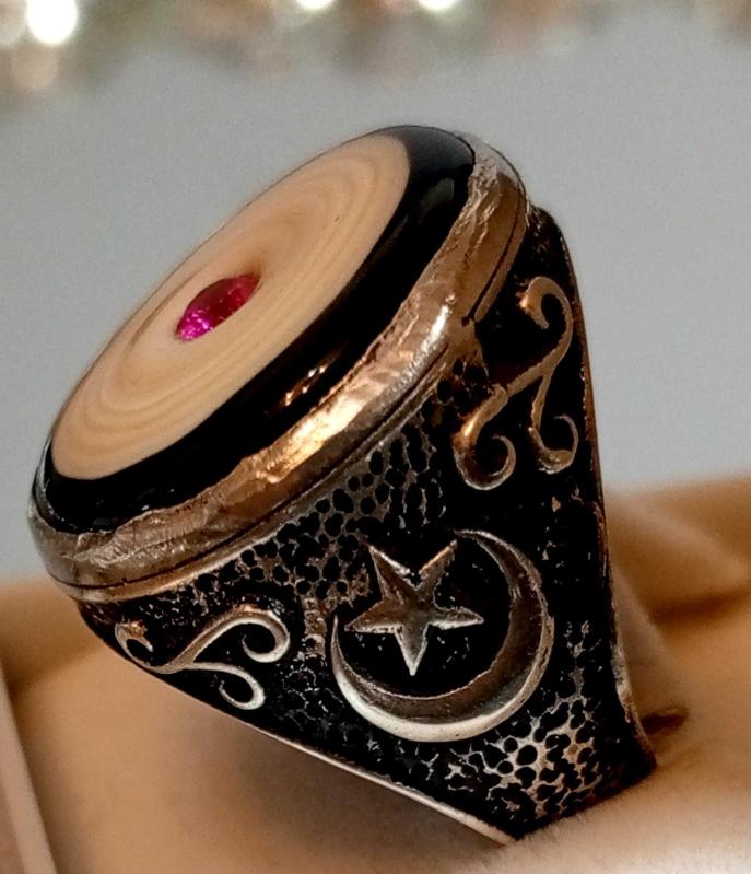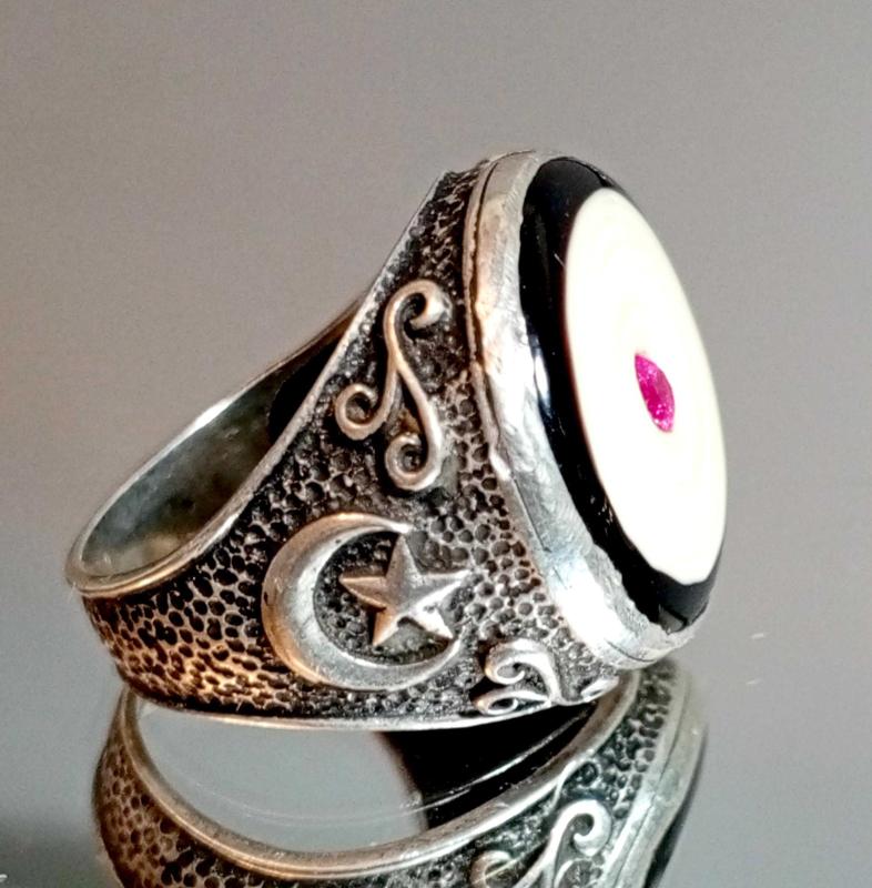 KATALİN ÜZERİNE YAKUT TAŞLI AY YILDIZ DETAYLI GÜMÜŞ YÜZÜK başlıklı ürün, Antika-Koleksiyon, Hobi-Sanat > Antika > Antika Takı ve Mücevher > Yüzük kategorisinde İkinci El olarak satışa sunulmuştur.