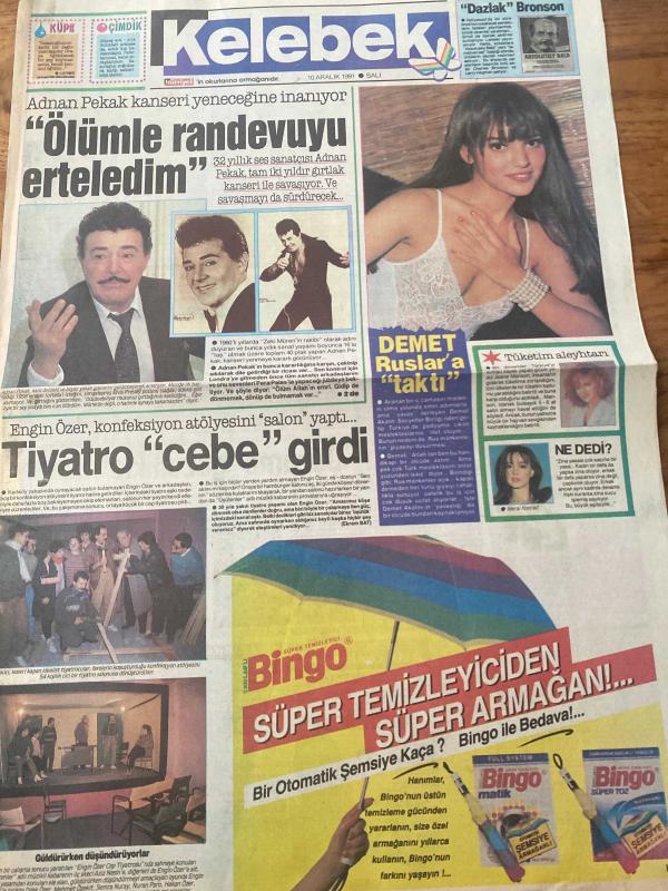 KELEBEK GAZETESİ DOĞUM GÜNÜ HEDİYESİ (TURKISH NEWSPAPPER) -10 ARALIK 1991 - TAM TAKIM 4 SAYFADIR -Adnan Pekak-Demet Akalın-Engin Özer-Murat Aykaç-Erginöz-Cemal Dündar-Azize Bergin-Okan Uysaler-Zeynep Uğur-Gündüz Tezmen-Mesut Yılmaz-Michel Douglas-Glenn Close-John Lithgow-Bill Maynard-Ross Ackland-Bahriye Aksoy-Selen Böke-Leyla Somer-Ölümle randevuyu erteledim-Demet Ruslar’a taktı-Tiyatro cebe girdi-Tutku-Bilmemek ayıp değil-Başka türlü olabilirdi Okan Bey-Salıncak-Mesut Yılmaz’a sürpriz konuklar-Bu filmi kaçırmayın-İki kadın arasında bocalıyor-Anneler ölmez-Tehlikeli Dedektif-Ana zayıflama tozu adlı eser Türkçe dilindedir.