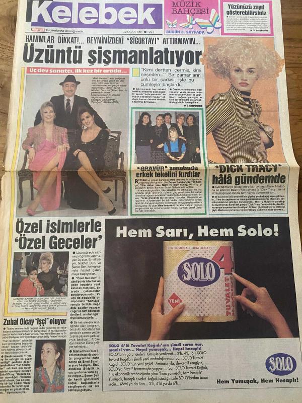 KELEBEK GAZETESİ DOĞUM GÜNÜ HEDİYESİ (TURKISH NEWSPAPPER) -22 OCAK 1991 - TAM TAKIM 4 SAYFADIR -Emel Sayın-Nükhet Duru-Şener Şen-Meral Mansuroğlu-Mine Arasan-Fatma Batukan-Berran Kançal-Tülin Aktar-Lale Naim-İlkay Sunay-Zuhal Olcay-Leyla İsmier-Ali Kocatepe-Zeki Müren-Bülent Ersoy-Muazzez Abacı-İbrahim Tatlıses-Sibel Can-Ayşe Tunalı-Hülya Avşar-Nalan Altınörs-Nuray Hafiftaş-Harika Avcı-Pınar Eliçe-Burhan Çaçan-Belkıs Akkale-Nur Ertürk-Sedat Örsel-Erdal İpekeşen-Ali Poyrazoğlu-Bülent Kayabaş-Ayşen Gruda-Zerrin Sümer-Levent Kazak-Nilüfer-Peker Açıkalın-Levent Tülek-Selma Güneri-Üzüntü şişmanlatıyor-Özel isimlerle Özel Geceler-Gravür sanatında erkek tekelini kırdılar-Dick Tracy hâlâ gündemde-Zuhal Olcay İşçi oluyor-Eğitim dediğin böyle olur-Melodili çoraplar-Bilmemek ayıp değil-Evlilik köşesi-Sesi Başkentte kulağı İstanbulda-Müzik Dostları-Harikaya çifte savcı-TRTde zihniyet değişecek-Kahkaha Tufanı-Mizah anarşistleri-Yıldızınız-Bu gecenin filmleri-Sarı Solo-Daki-Ka-Müzik Bahçesi-Kelebek- adlı eser Türkçe dilindedir.