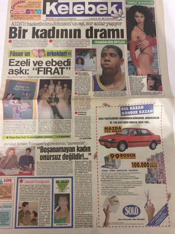 KELEBEK GAZETESİ DOĞUM GÜNÜ HEDİYESİ (TURKISH NEWSPAPPER) - 4 ARALIK 1991 - TAM TAKIM 6 SAYFADIR -Füsun Önal-Magic Johnson-Birsen Yılmazer-Murat Aykaç Erginöz-Cemal Dündar-Azize Bergin-Adnan Şenses-Zeki Müren-Muazzez Abacı-Coşkun Sabah-Ayhan Aşan-İzzet Altınmeşe-Nuray Hafiftaş-Sigourney Weaver-Anthony Hopkins-Bir kadının dramı-Ezeli ve ebedi aşk Fırat-Boşanamayan kadın onursuz değildir-Bilmemek ayıp değil-Durmayın harekete geçin-Şarkıcı dediğin-Yuva da aşk-Duvarların ötesi-Bir Engel Daha-Aşk Üçgeni-Sistaki Goriller-Hep Benim Başıma Geliyor adlı eser Türkçe dilindedir.