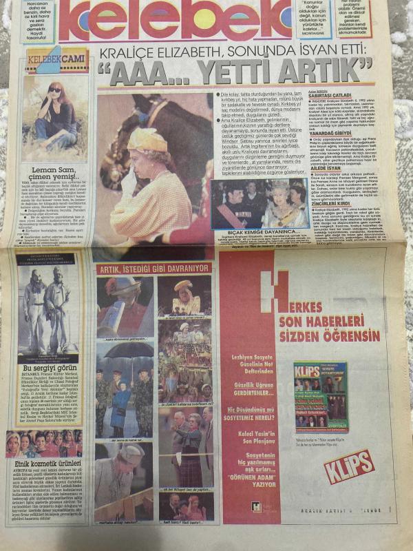 KELEBEK GAZETESİ DOĞUM GÜNÜ HEDİYESİ (TURKISH NEWSPAPPER) - 8 ARALIK 1992 - TAM TAKIM 4 SAYFADIR -Kraliçe Elizabeth-Azize Bergin-Fatih Çekirge-Gündüz Tezmen-Muhteşem Nejdat-M. Ata Nurun-Güzin Abla-Kraliçe Elizabeth sonunda isyan etti-Aaa yetti artık-Leman Şam çimen yemiş-Bıçak kemiğe dayanınca-Artık istediği gibi davranıyor-Bu sergiyi görün-Etnik kozmetik ürünleri-Herkes son haberleri sizden öğrensin-Kadın bakanlığı-Erkek adam temizlikçi olmaz-Ev kadınına dolgun maaş-Kim korkar gripten-Her şey daha dün gibi unutulmaz anılar-Selülite karşı savaşın-Lahana yapraklarını değerlendirin-Huzur dolu yaşlılık-Gaultierin defile hazırlığı adlı eser Türkçe dilindedir.