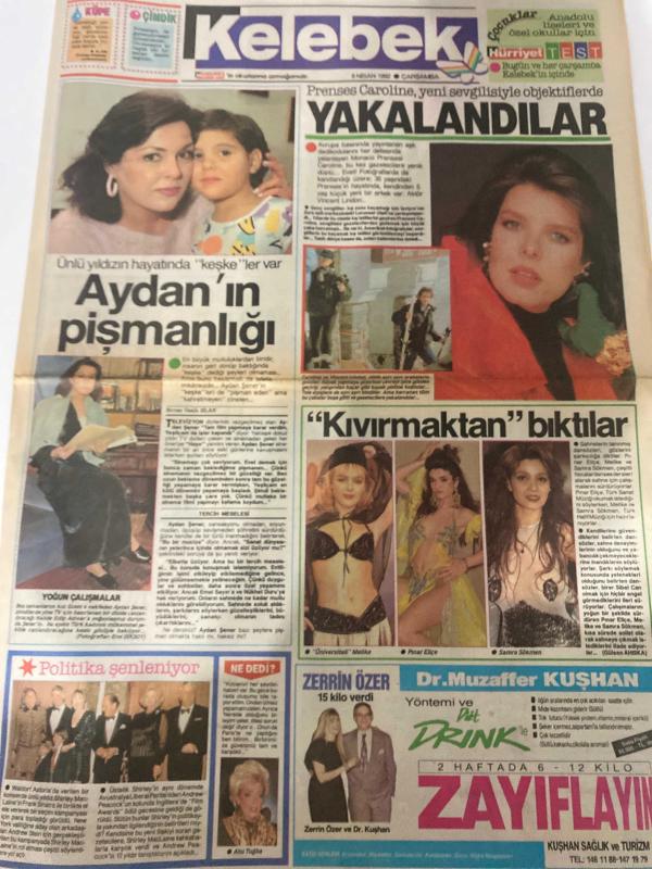 KELEBEK GAZETESİ DOĞUM GÜNÜ HEDİYESİ (TURKISH NEWSPAPPER) - 8 NİSAN 1992 - TAM TAKIM 6 SAYFADIR -Aydan Şener-Prenses Caroline-Vincent Lindon-Cemal Safi-Orhan Gencebay-Ahmet Özhan-Hurşid Yenigün-Zerrin Özer-Dr Muzaffer Kuşhan-Muzaffer Buyrukçu-Cemal Dündar-Dr Gündüz Tezmen-Azize Bergin-Muhteşem Nejad-Aydan ın pişmanlığı-Yakalandılar-Kıvırmaktan bıktılar-Politika gençleniyor-Gençebay dan Disco rap-Bir seksi türkücü daha-Haydi stres atalım Ciftetelli Türküko-Fransız zayıflama çayı-Beylerin dikkatine Sprey-Lens de olay-Cildiniz dostunuz-Evlilikte susmaya da yer var-Ters ilişki zararlı mı-Sizleri arıyoruz-Herşey güzellik uğruna-Kış güneşi daha tehlikeli-Bilmemek ayıp değil-Akan sular sarap olsa-Sevgili Güzin Abla-Evlilik Köşesi-Müzik Bahçesi-Bilgi Yarışması-Rüyalarınızdaki otomobil sizin olacak-Dünya Sağlık Merkezi-Ütülü halılar-Kahve zevki-Lokanta seçimi-Yarın Makyaj sanattır-Yıldızınız-Soru ve yanıt-Bizimkiler-Fatoş-Güngörmüşler-Dedektif Nik-Ninja Kaplumbağalar-Jaycees Türkiye Adaylık For adlı eser Türkçe dilindedir.