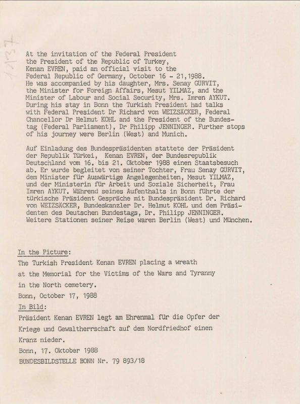 ** KENAN EVREN ALMANYA ZİYARETİ BÜYÜK BOY FOTOĞRAF ** Yaklaşık 24 x 18 cm.ebadında,arkası yazılı, gayet temiz vaziyette eski ve orijinal fotoğraftır...