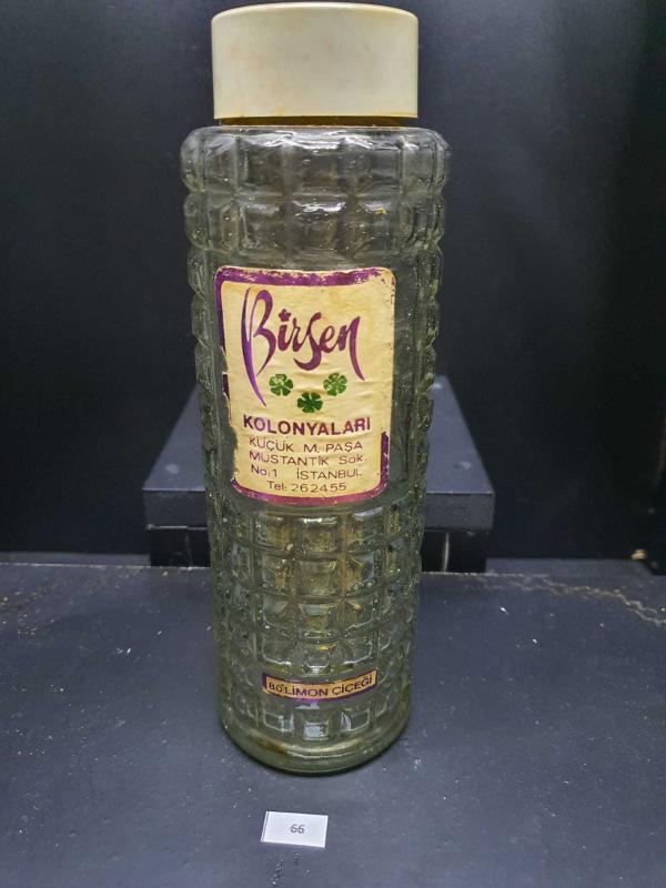 BİRSEN KOLONYAĞI etiketli kapaklı kesme cam şişe kusursuz 1970 ler