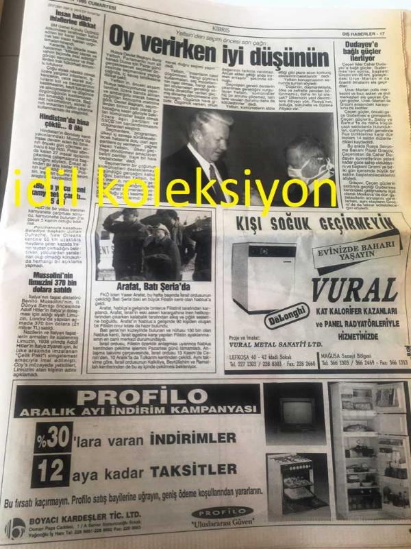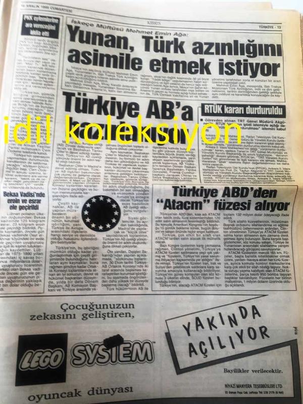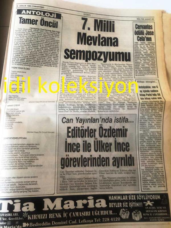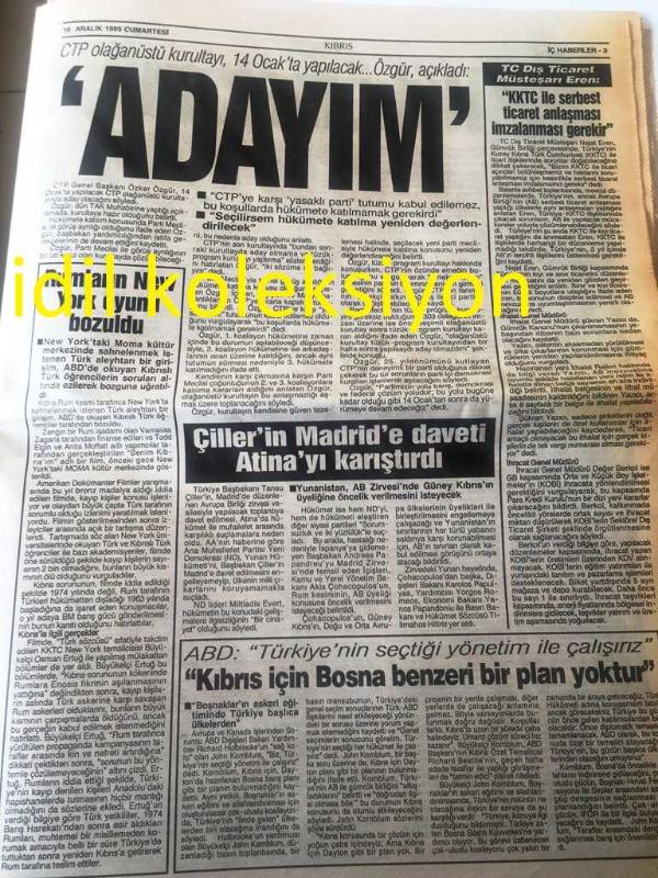 KIBRIS GAZETESİ YEREL TAŞRA BASINI --- 16 Aralık 1995 Yıl :7 Sayı :2282--Sözünüzü Tutun --Haspolat artık korkmuyor --Kadrosuzlar ısrarlı --Güney de Christmas parıltısı --CTP olağanüstü kurultayı , 14 Ocak 'ta yapılacak Özgür Adayım --Çiller 'in Madrid 'e daveti Atina 'yı karıştırdı --KKTC ile aynı kaderi paylaşıyoruz --Bölünmüş Ülke Kıbrıs --Yunan ,Türk azınlığı asimile etmek istiyor **Türkiye AB 'a Hazırlanıyor --Türkiye ABD 'den Atacm Füzesi Alıyor --AB de tek para birimi --Oy verirken iyi düşünün --Vergi peşinde koşmadılar güldüler eğlendiler --Alkışlar Jazz Mania 'ya --Antoloji :Tamer Öncül ---7. Milli Mevlana Sempozyumu --Editörler Özdemir ,İnce, Ülker Görevlerinden Ayrıldı --Cervantes Ödülü Jose Cela 'nın --Recep ile Alpay Kart Tiryakisi ---Galatasaray de iyi futbol moral verdi -- Fenerbahçe de Mustafa Karşıyaka Yolcusu --Devlet Bakanı Barutçu Umutlu : Dünya Kupası Elemeleri 'inde Şanslıyız --Cemal İneci Şenlik 'i geçti -- Yıpranma, sararmalar, kupon kesiği ve yırtılmalar zamana bağlı olarak görülebilir.