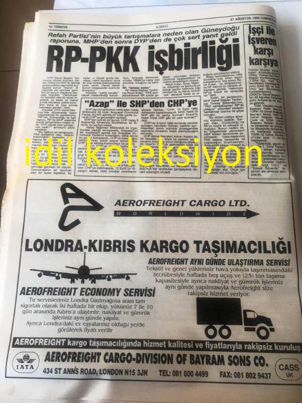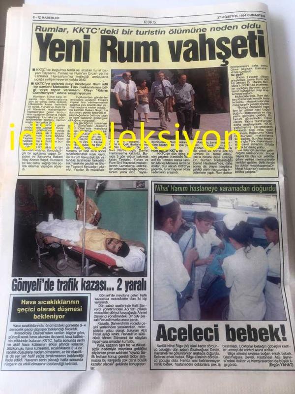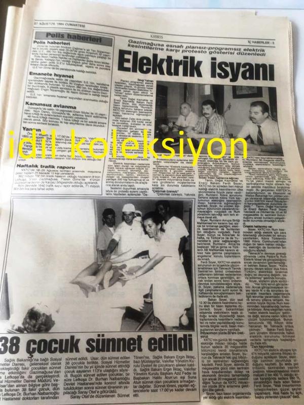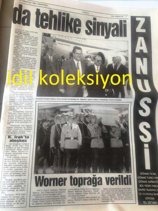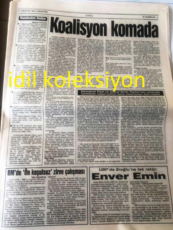 KIBRIS GAZETESİ YEREL TAŞRA BASINI ----27 Ağustos 1994 Yıl :1 Sayı :1809-Hükümet ortakları Kıbrıs Sorununda anlaşamadı ve :Koalisyon komada --UBP''den Eroğlu 'na tek rakip Enver Emin --Gazimağusa esnafı plansız -programsız elektrik kesintilerine karşı protesto gösterisi düzenledi Elektrik isyanı --Rumlar , KKTC ' de ki bir turistin ölümüne neden oldu Yeni Rum Vahşeti --Girne Belediyesi 'ne 60 çöp bidonu hediye edildi--Ticaret Odası Kdv 'ye karşı - RP -PKK İşbirliği --Rum , garantör Türkiye 'den rahatsız --Klerides , Denktaş 'ı uzlaşmazlığa itiyor --Almanya Dış işleri bakanı Klaus Kinkel Hırvatistan 'da Zagreb 'e gelen bakanı meslektaşı Graniç karşıladı --Nato Genel Sekreteri Manfred Wörner toprağa verildi --İki Mustafa Denizer ,Londra da Buluştu --Aşkınız için check -up yapın -- Can Tufan :Türk Pop Müziğinde patlama değil ,enflasyon var --Avrupa 'nın yeni prensi Panucci --Baresi 'nin gönlü Japonya da -Ewing Güney Afrika da --Fenerbahçe de müjdat kadroda-- Yıpranma, sararmalar, kupon kesiği ve yırtılmalar zamana bağlı olarak görülebilir.