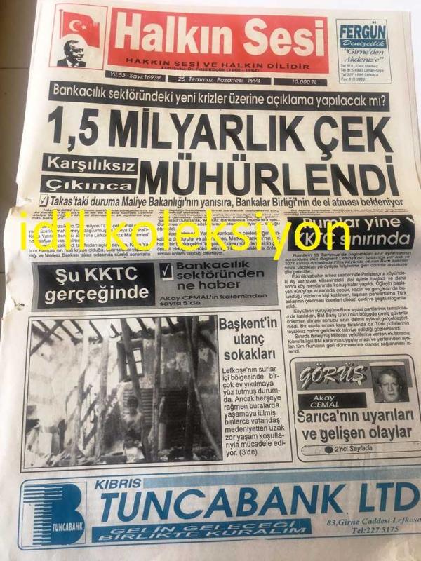 KIBRIS HALKIN SESİ GAZETESİ YEREL TAŞRA BASINI--25 Temmuz 1994 Yıl :53 Sayı :16939---1,5 Milyarlık Çek Mühürlendi ---Rumlar KKTC sınırında--BD 'de 20 Temmuz --Eşref Çetinel :Amerika ve Kliridis Ne İstiyor ?--Turizm de canlanma--Bankacılık sektöründen ne haber :Akay Cemal -- Sıdıka Atalay :Türkiye Ekonomisi--Denktaş 'tan açıklama istenecek Avrupa Mahkemesinin Ambargo Kararı --Prenses Diana 'ya Öfke --Dünyanın En Pahalı Senaryosu ----Çöktü Çöküyor 20 Milyarınız Var Mı ?--İpek Uzunoğlu ABD de ki başarısı --Kamran Aziz 'den müzik dünyasına anlamlı albüm --Recep Güvelioğlu :Kıbrıs ve Ecevit --Atletizm yalnızca okul düzeyinde yapılıyor--A. Rıza Altay doğru bir karar vermedi -- Yıpranma, sararmalar, kupon kesiği ve yırtılmalar zamana bağlı olarak görülebilir.
