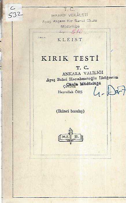 KIRIK TESTİ, KLEİST tarafından kaleme alınmıştır. Kitap 1964 yılında M.E.B. tarafından [İSTANBUL] yayınlanmıştır. Bu baskının çevirisi HAYRULLAH ÖRS tarafından yapılmıştır. 92 sayfadır. KIRIK TESTİ adlı eser Türkçe dilindedir.