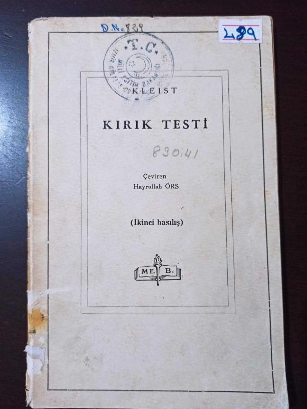 KIRIK TESTİ, KLEIST tarafından kaleme alınmıştır. Kitap 1964 yılında MEB tarafından [İstanbul] yayınlanmıştır. Satışta olan kitap, yayınevinin 2. baskısıdır. Bu baskının çevirisi HAYRULLAH ÖRS tarafından yapılmıştır. 92 sayfadır. KIRIK TESTİ adlı eser Türkçe dilindedir.