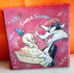 KIRMIZI EL BOYAMA AHŞAP KUTUSU YAPIŞTIRMA RESİMLİ TWEEYT VE SYLVESTER KUTU 16 CM KARE DERİNLİK 9 CM