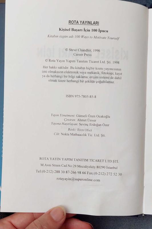 KİŞİSEL BAŞARI İÇİN 100 İPUCU STEVE CHANDLER ROTA YAYINLARI 1998 BASKI 203 SAYFA EKSİK, YIRTIK, ÇİZİK, KOPUK SAYFA YOKTUR. ÇOK İYİ DURUMDADIR. 2. EL KİTAP
