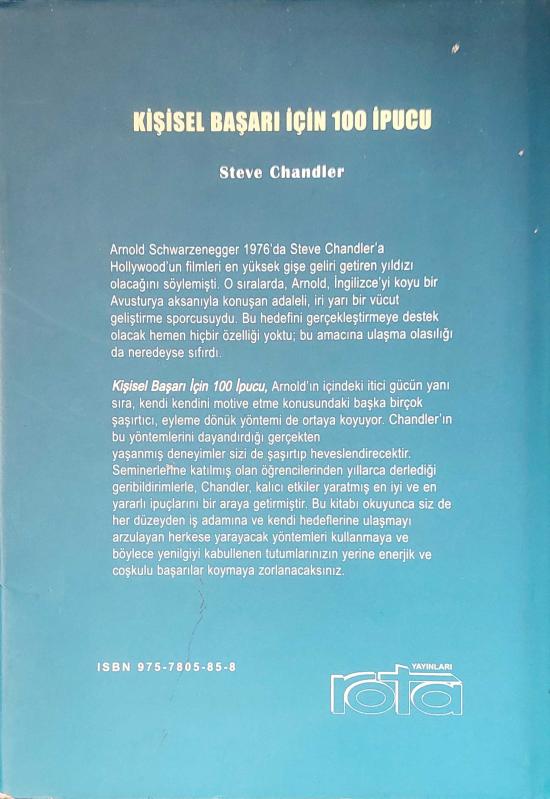 KİŞİSEL BAŞARI İÇİN 100 İPUCU, STEVE CHANDLER tarafından kaleme alınmıştır. Kitap 1998 yılında ROTA YAYINLARI tarafından [İSTANBUL] yayınlanmıştır. Satışta olan kitap, yayınevinin 1. baskısıdır. Bu baskının çevirisi AHMET ÜNVER tarafından yapılmıştır. 203 sayfadır. KİŞİSEL BAŞARI İÇİN 100 İPUCU adlı eser Türkçe dilindedir.