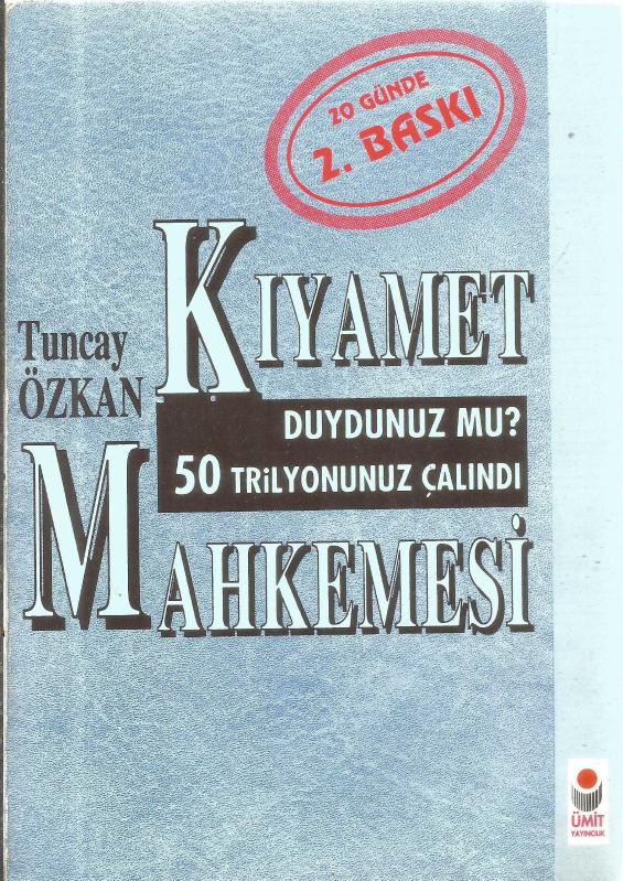 KIYAMET MAHKEMESİ DUYDUNUZ MU 50 TRİLYONUNUZ ÇALINDI 2.BASKI, TUNCAY ÖZKAN tarafından kaleme alınmıştır. Kitap 1993 yılında ÜMİT tarafından [İSTANBUL] yayınlanmıştır. 236 sayfadır. KIYAMET MAHKEMESİ DUYDUNUZ MU 50 TRİLYONUNUZ ÇALINDI 2.BASKI adlı eser Türkçe dilindedir.