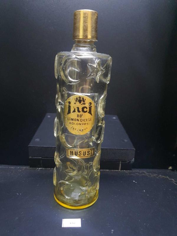 etiketi sağlam ay yıldız kabartmalı cam kapaklı kolonyağı şişesi 19 cm 1950 li yıllar