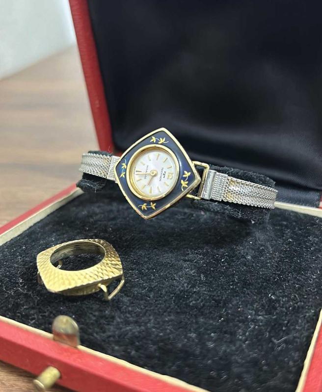 KOMPLE GÜMÜŞ KORDONLU ALTIN MİNELİ KURMALI KADIN KOL SAATİ başlıklı antika/koleksiyon objesi Avrupa menşe’lidir. 1940 sonrası dönemine aittir.